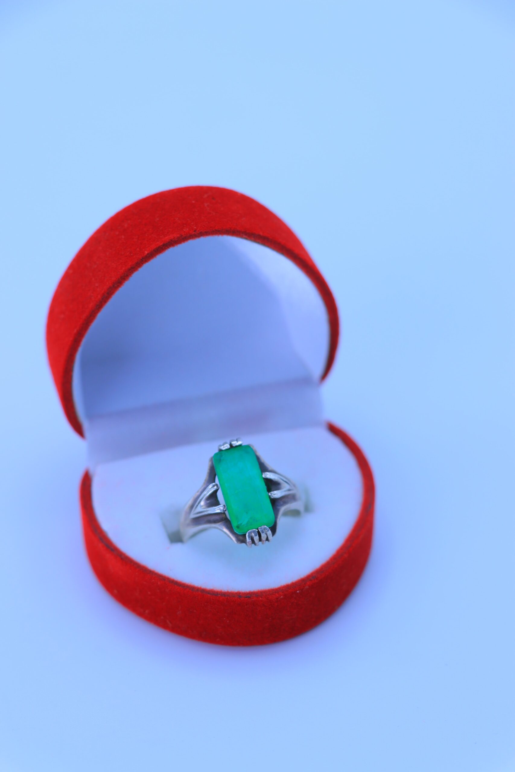 Ein stilvoller Silberring mit einem leuchtend grünen rechteckigen Edelstein, präsentiert in einer edlen roten Schmuckbox.